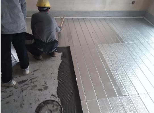 粘結(jié)劑按產(chǎn)品包裝及說明書進(jìn)行配制,機(jī)械攪拌均勻,粘結(jié)劑滿涂在干式地暖板背面,厚度5mm,粘貼時,應(yīng)均勻按壓并調(diào)平;鋪設(shè)應(yīng)平整,板縫應(yīng)自然靠緊,相鄰板面平整;