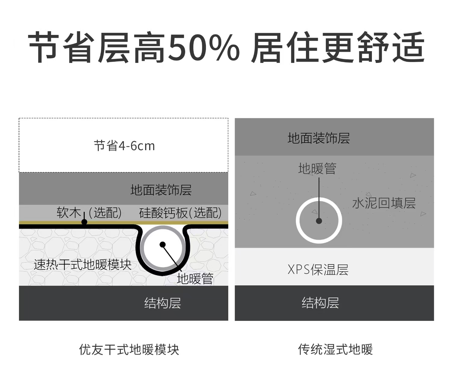 高抗壓干法模塊無需水泥回填,較傳統(tǒng)濕式地暖直接節(jié)省4-6cm層高。對于層高2.7m以下的老房或小戶型,這點差距能顯著提升居住壓抑感,讓空間更通透。
